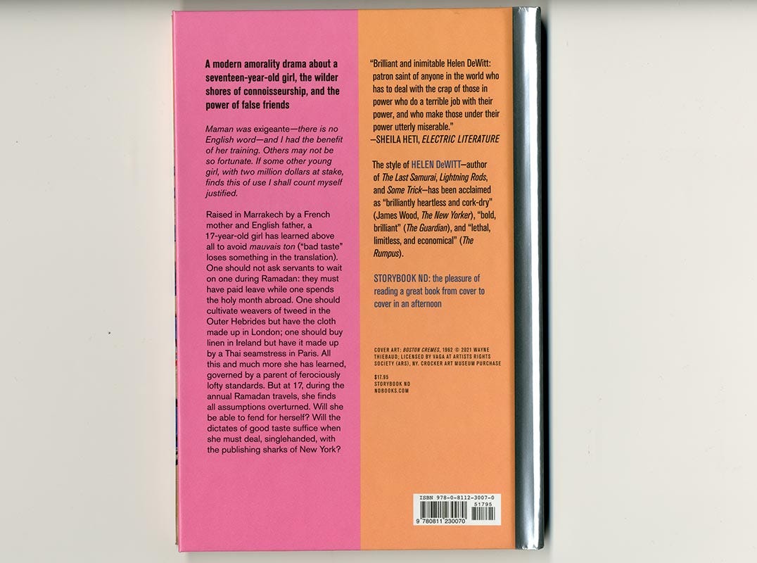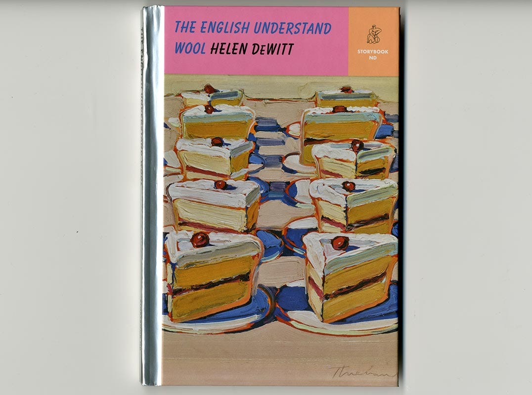 The present London exhibition of the work of the US artist Wayne Thiebaud (1920–2021) provides one prompt for this revival of an article that I posted on the Hyphen Press website. One of Thiebaud’s still lifes is used on the cover of Helen DeWitt’s The English understand wool. This book was published in 2022 by New Directions in the first batch of their ‘Storybook ND’ series, advertised with the line ‘the pleasure of reading a great book from cover to cover in an afternoon’. DeWitt is American, and lives in Berlin; this story mainly takes place in Europe. I’m not sure why this image was chosen for this text, but it is memorable and perhaps hints at the promise of pleasure, which is a factor in the story.
