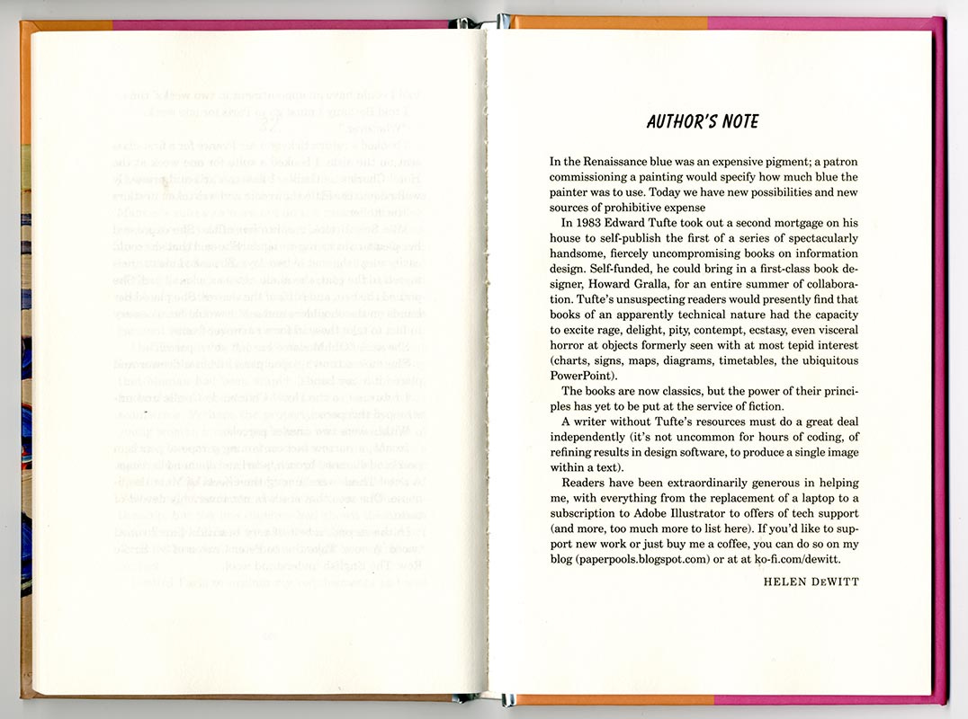 In her afterword DeWitt suggests that the power of the Tufte’s principles ‘has yet to be put at the service of fiction’. But: ‘A writer without Tufte’s resources must do a great deal independently (it’s not uncommon for hours of coding, of refining results in design software, to produce a single image within a text).’ Thanking her readers for their support in helping her to replace a laptop and to fund a subscription for Adobe software, she ends with an appeal for further help in this department of technical production.