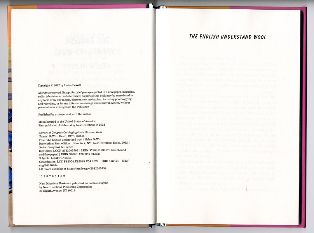 All this may seem trivial and nit-picking stuff. I may have been worrying about it for a long time, yet wouldn’t think of burdening the world with these considerations. But at the end of last year I read in the London Review of Books a review that went out of its way to mention, in the course of the piece, the number of pages of the work under consideration: a story or novella by Helen DeWitt, with the wonderful title The English understand wool. David Trotter, in describing the extreme brevity of the story writes that it has ‘69 pages, many of them largely blank’. Though I hadn’t read any of DeWitt’s work, I remembered that some years ago I had had a brief email exchange with her. I regret that the emails are now lost from my hard discs, but I think the topic was pictograms. As this latest work shows, she is unusually interested in the material production of texts. This review felt like a reasonable prompt to raise the general issue of how exactly we measure the extent of a book, and I wrote a letter to the LRB.