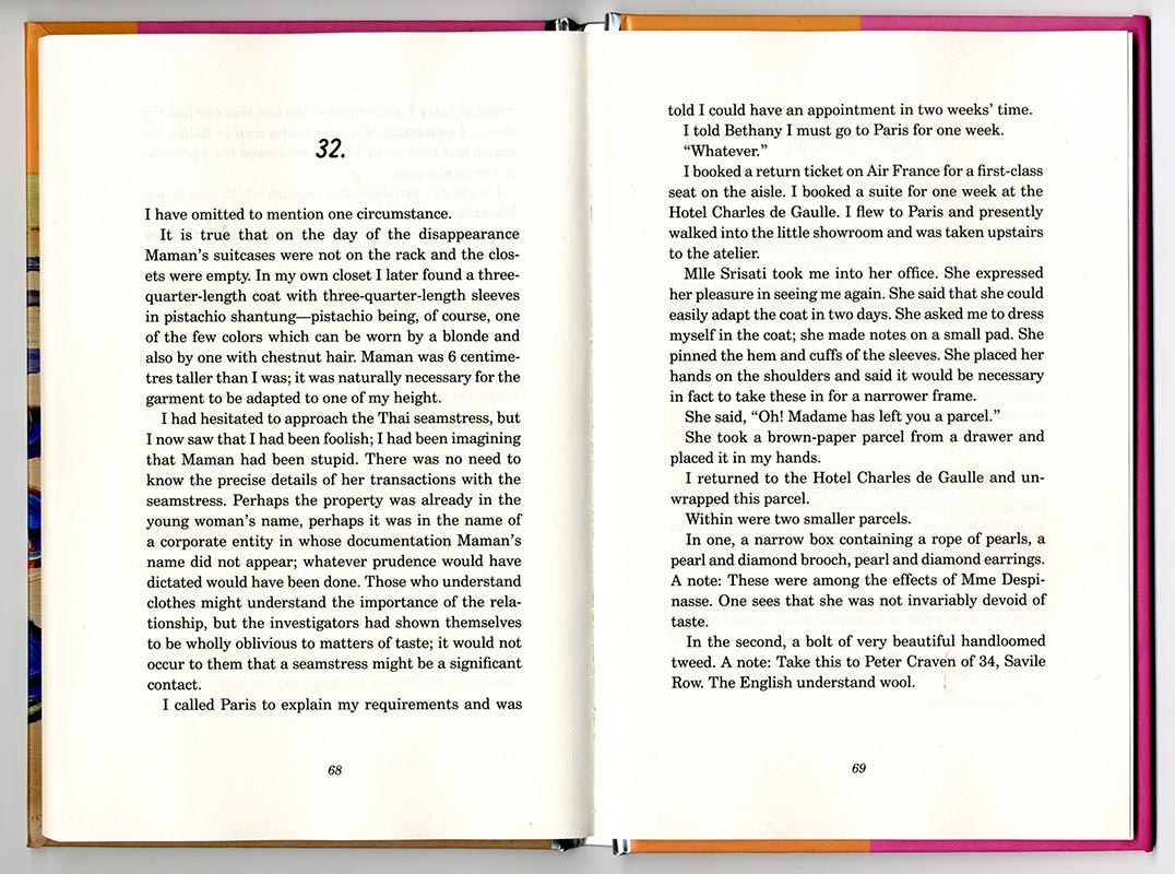 The bibliographic description of the book in the LRB gives an extent of 69 pages. But page 69 is just the last numbered page; the book is made of 72 pages. Pages 70 and 72 are blank, and page 71 carries an author’s note. This note is set in a slightly smaller size of type, appropriately for the content, and this also helps to keep it within one page. DeWitt here addresses the theme of book production and how much control an author can have and what this might cost. She refers to Edward Tufte and his series of self-published books on information design, in which he gained complete control of production. Tufte’s books, which, as the series went on, became increasingly lavish and no-expense-spared, are good examples of the drive for perfection and bon ton (good taste) that are the leading principles of the mother of Marguerite and now Marguerite herself.