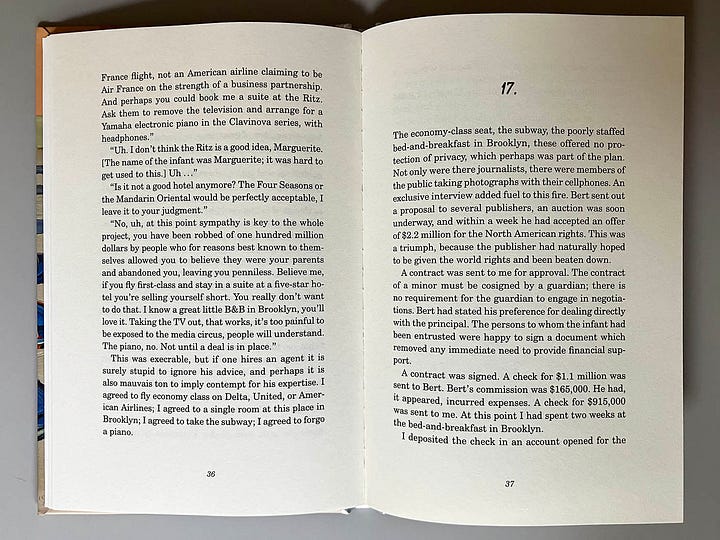 The contract arrives from her agent as a Word document attached to an email. Marguerite writes: ‘I was surprised that the contract had not been sent in a watermarked PDF, for example, but no doubt all concerned were anxious to close the deal while the author was isolated, distraught.’ (p. 53) She revises the text of the Word document so that it balances more in her favour. The publisher’s draft text had stipulated that if the text is not acceptable to them, then they will not publish. And further: not only will the final payment to the author not be made, but the advance payment ($1.1 million) should be repaid, and the agent’s fee kept by the agent. Marguerite’s revised text states that the manuscript will be acceptable if it covers the facts known to the author, that no changes will be made to the text without the author’s approval, that in the event of no publication the advance payment will be kept by the author. She prints out five copies, signs them, and sends them off with FedEx. The document is then signed by all parties.