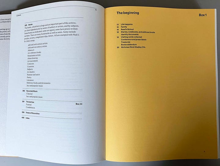 The listings conclude with a catalogue of books in Nick’s library, and then his collection of recorded music – LPs, tapes, CDs: classical (Bach to Kurt Weill and John White), jazz and popular (The Beatles through Krzysztof Komeda, Bessie Smith, to Stevie Wonder). Then box 44, the last one: ‘The three grey lever arch files in this box are about Nick’s health, or lack of it.’ (p. 393) The long index of names (pp. 411–23) is excellent.