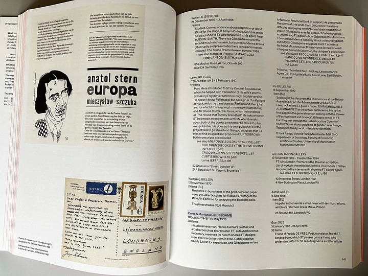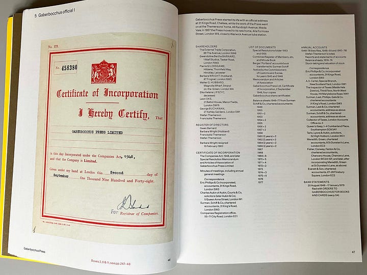 In 2020 the extraordinary three-volume Themerson archive was finished and published, edited by Jasia and Nick. A physical description comes first: 1044 pages (vol. 1: 472, vol. 2: 372, vol. 3: 260), page size 310 x 235 mm, and including the box in which the books are housed its weight is 5.8 kg. Volume 1 describes the letters and documents in the archive; volume 2 documents the life and works of each subject; volume 3 provides documentation of Gaberbocchus Press, which the Themersons ran from 1948 to 1979, publishing over 50 books.