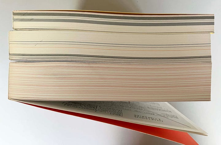 One detail to point out: ‘Where there is a particularly significant statement or piece of information, it is highlighted in blue for Stefan or orange for Franciszka.’ So some lines of text are given these apparently freely applied patches of transparent colour, as if someone has been there before us, going through the book with a highlighter pen. This does bring some sense of variety, something extra, to the pages – and it’s good that fluorescent ink hasn’t been used.