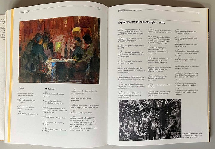 It’s a substantial work: 424 pages, page size 280 x 210 mm, 1.5 kg in weight. I count three different papers used within the book, plus endpapers, card cover material, and a wraparound sheet of slightly sparkling Japanese-type paper that has the title text impressed into it. These materials are delicately and expertly deployed, especially the sand-coloured sheets that introduce the pages devoted to each of the boxes of the archive and whose number is constrained by the restrictions of how the sections have to be gathered and bound.